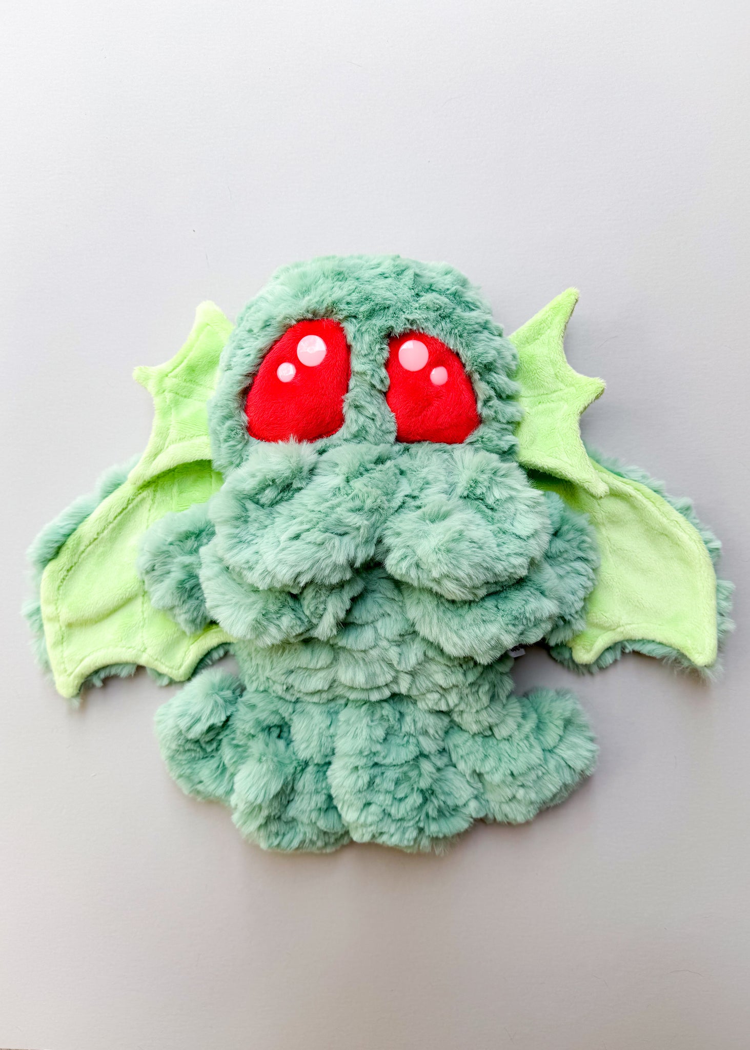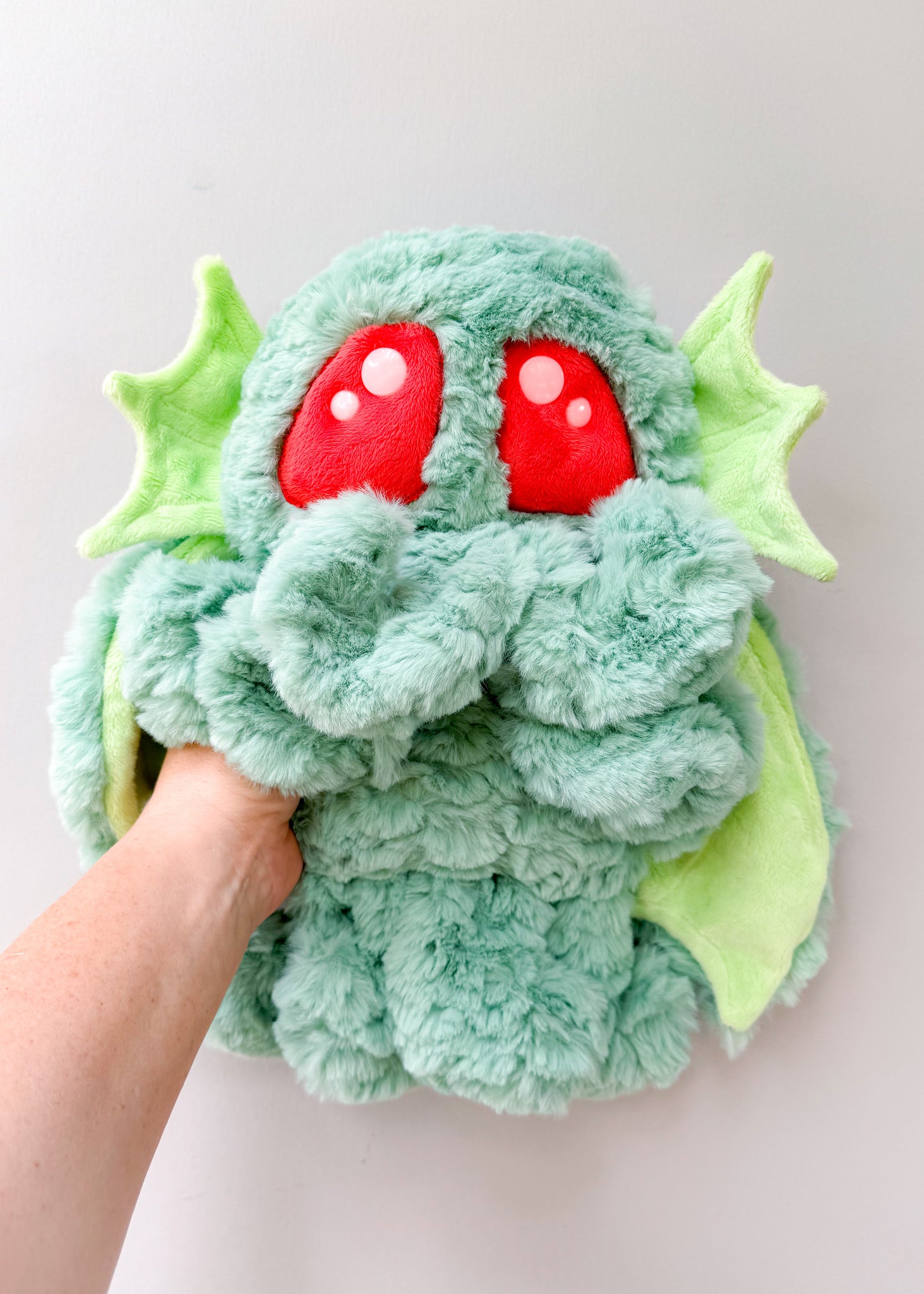 Description: Meet Cthy, a 14.5” doe-eyed Cthulhu plushie who loves to drift through the deep, dark ocean at night. With soft tentacles and a gentle gaze, they bring a touch of cosmic wonder and sea-soaked calm wherever they go.