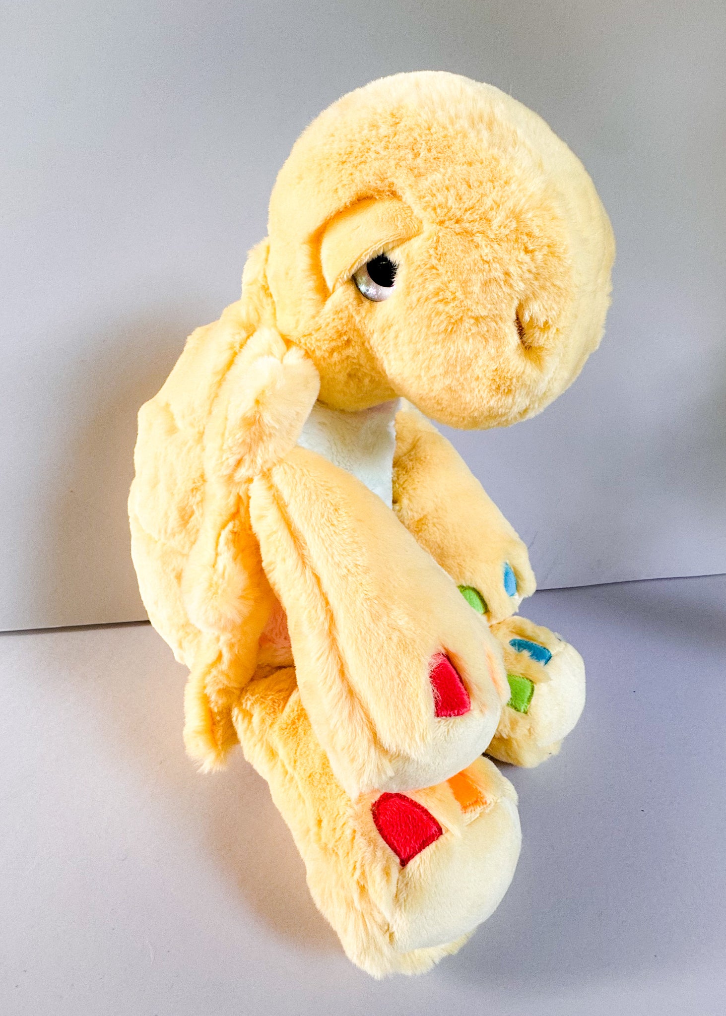 GlowSlow is 22” in total length. Weighted with poly pellets in the hands, feet and also the tummy. GlowSlow has many hand sewn elements and is not recommended for rough play.